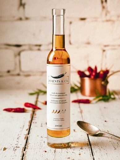 Tout commence par des piments du Québec sélectionnés et rôtis avec soin pour libérer leurs notes fumées. Ils sont ensuite plongés dans une infusion lente, une méthode patiente qui permet de capturer l'âme du piment sans aucune amertume.